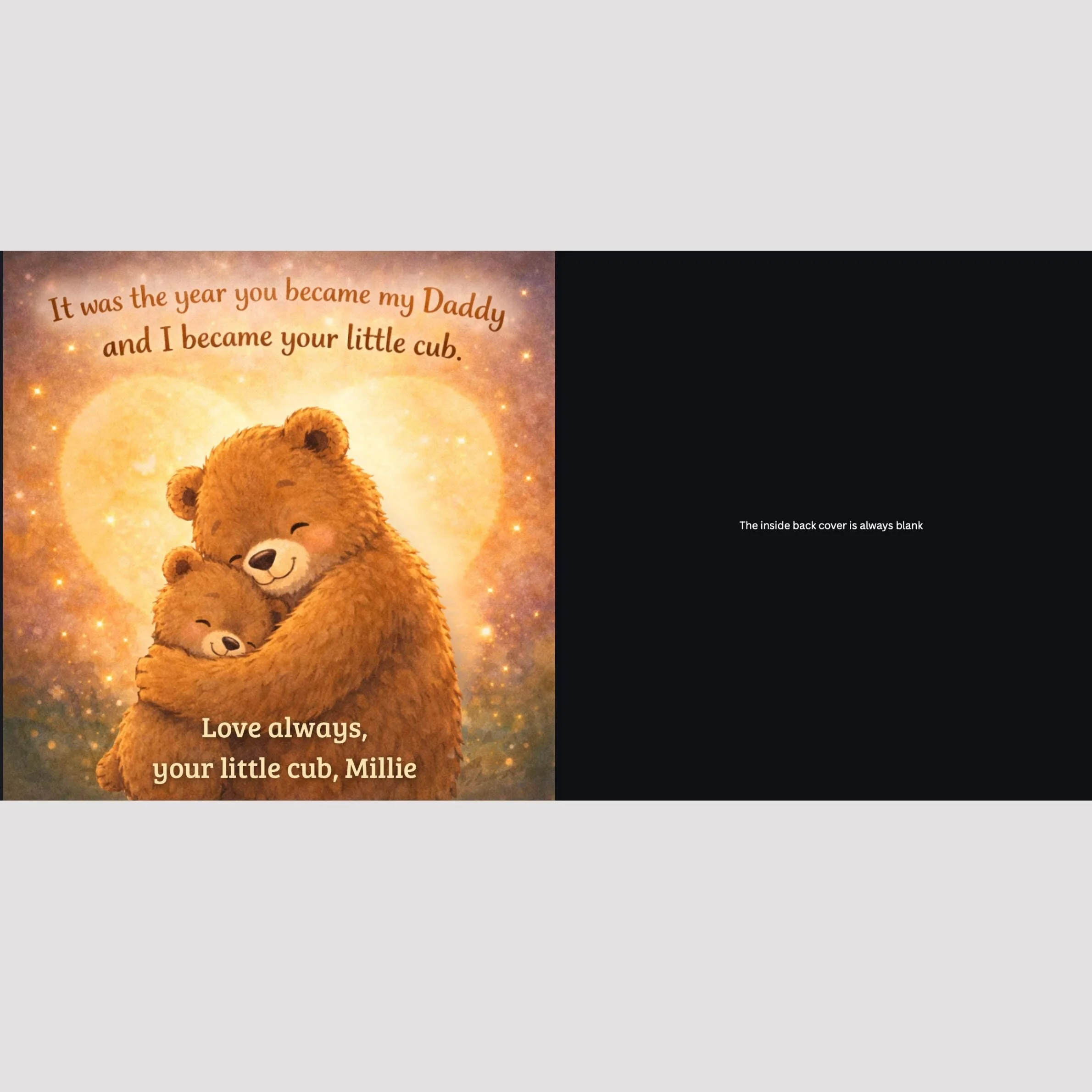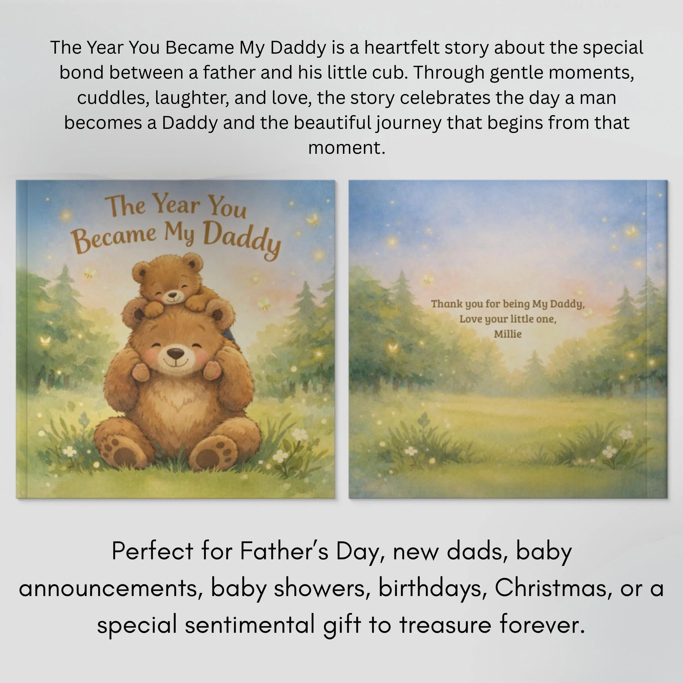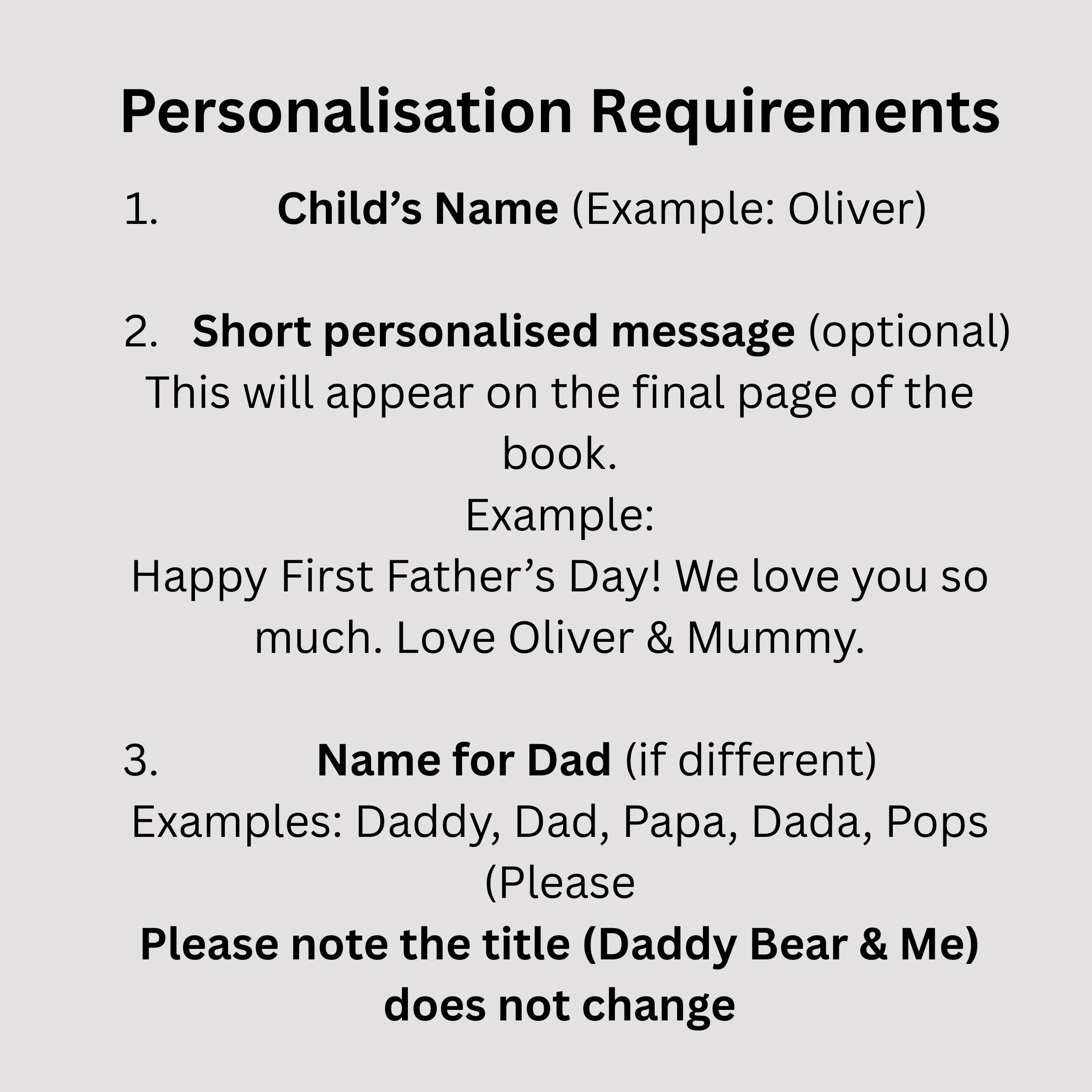 Make this story truly special by adding: • Baby’s name • Daddy’s name • Optional message or dedication Your personalised details will be included in the story to create a unique keepsake book just for your family.