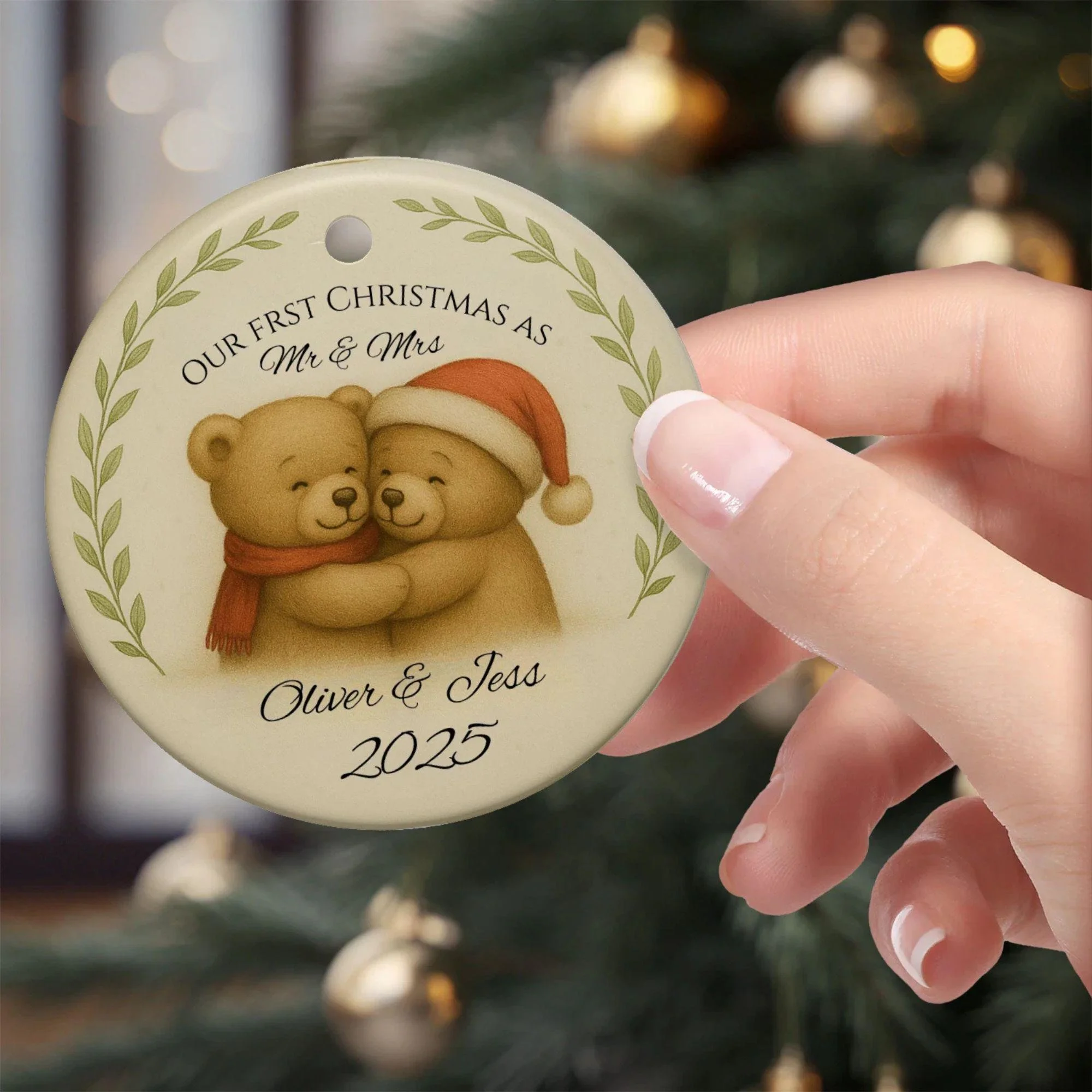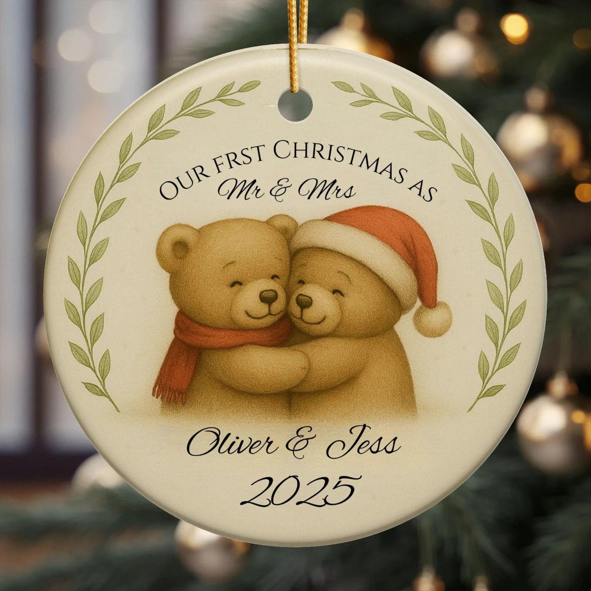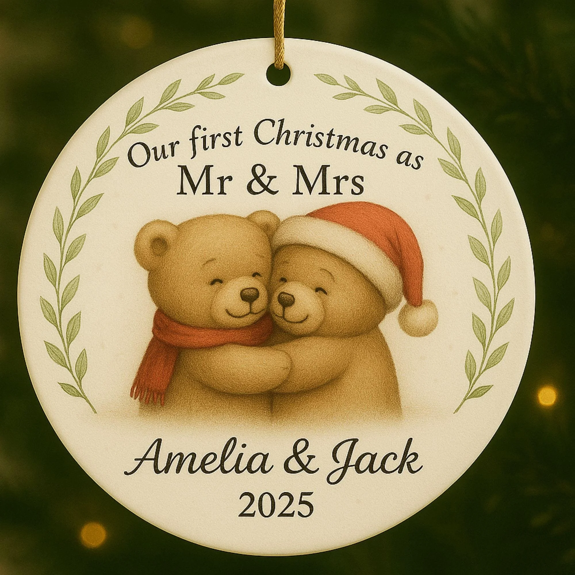 Celebrate your love story with this personalised “Our First Christmas as Mr & Mrs” ornament, featuring two adorable teddy bears hugging beneath the warm glow of Christmas lights. Hand-drawn in a soft, detailed festive style, this keepsake captures the magic of your first Christmas as a married couple.